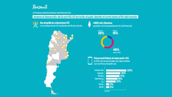 El servicio 4G de Personal está presente en 22 ciudades de 16 provincias: Buenos Aires, Córdoba, Rosario, Mar del Plata, Pinamar, Salta, Santa Fe, Tucumán, Bariloche, Corrientes, Resistencia, Formosa, La Rioja, Mendoza, Paraná, Posadas, Santiago del Estero, Ushuaia y recientemente se presentó en San Luis, San Clemente del Tuyú, Concordia y Puerto Iguazú.