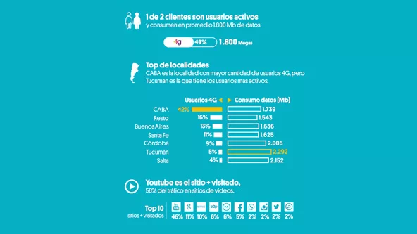 Con su red LTE desplegada en 22 ciudades del país, Personal ya suma 800.000 clientes con esta tecnología, 50% de ellos como usuarios activos. En Tucumán se da el mayor consumo per cápita y los sitios de mayor tráfico son -en ese orden- YouTube, Google y Netflix. Infografía explicativa en nota completa.