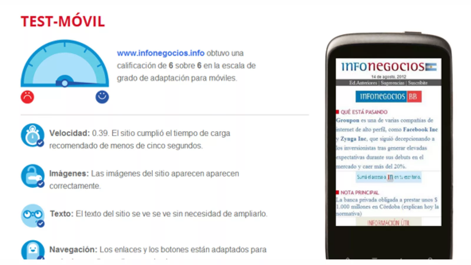 Estuvimos probando la versión para móviles de InfoNegocios y la verdad es que la herramienta de Google brinda un análisis básico completo de las características fundamentales que debe cumplir un sitio especialmente desarrollado para smartphones.
