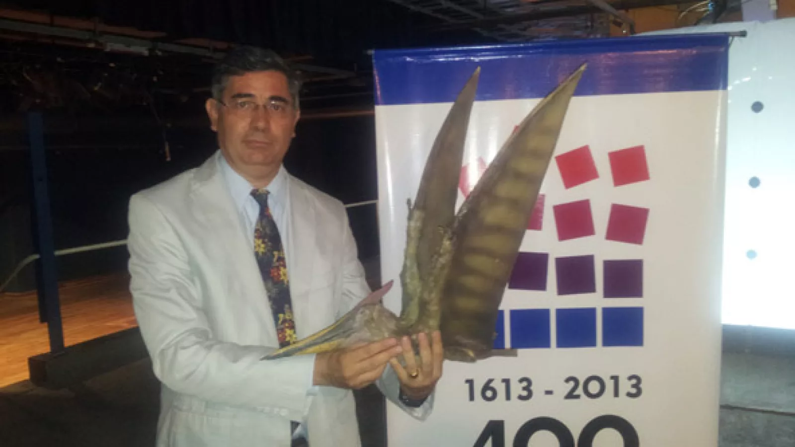 Un pteranodon robot en las manos de su creador, el Ing. Pailos