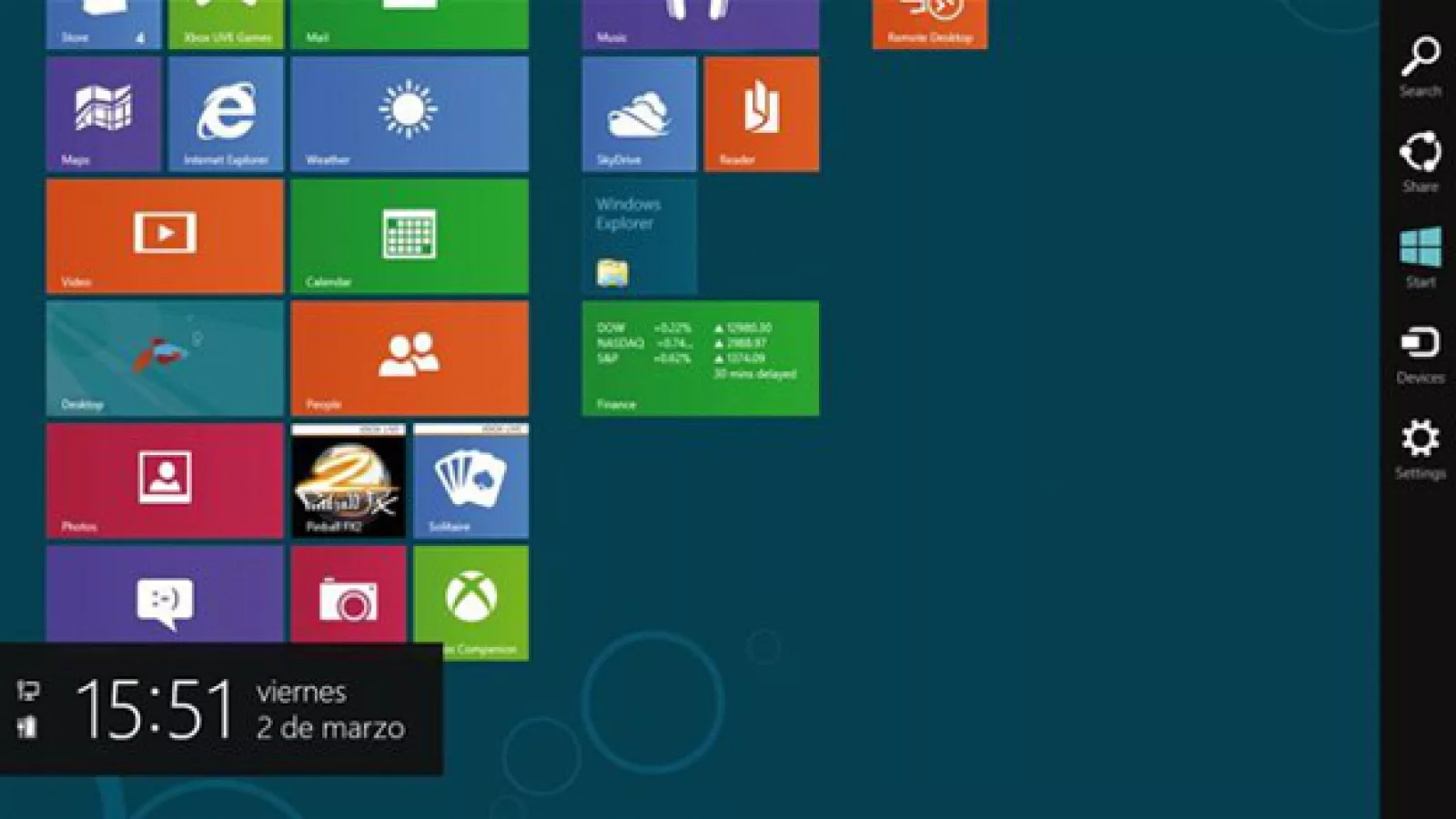 Las esquinas activas son un diferencial importante en el nuevo Windows. Cada una de las esquinas permite acceder a determinadas funciones según la zona en la que nos encontremos. Lo más importante es saber que llevando el puntero a la esquina superior o inferior derecha veremos un menú de grandes dimensiones con diferentes opciones. Allí veremos por ejemplo el ícono Start, que nos permitirá volver rápidamente a la pantalla de inicio. Lo acompañan otros bastante habituales, como el de búsquedas (Search) o Configuración (Settings). Junto con este menú aparecen la fecha y hora ya no siempre visibles.