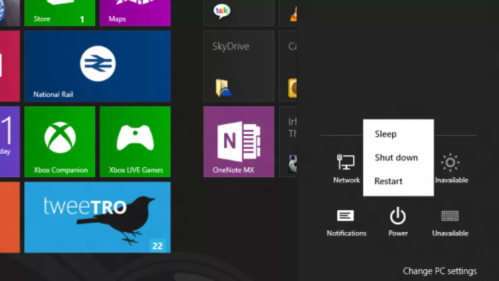 Para apagar la Pc en Windows 8 se requieren un par de clics más que en el 7. Hay que ir al menú que aparece al llevar el puntero a la derecha de la pantalla ir a “Configuración”, luego a “Iniciar/Apagar” y allí elegir entre Apagar, Suspender o Reiniciar.