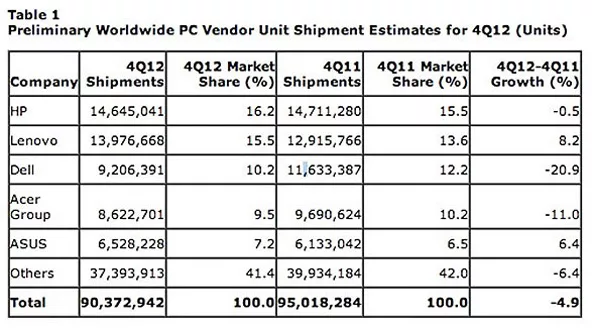 El último trimestre de 2012 (4Q) reafirmó la tendencia negativa que durante todo el año se estuvo viendo en los niveles de venta de computadoras comparado con los mismos períodos de 2011. El resultado global habla de una caída del 4,9% en las ventas de PC a nivel mundial comparando el 4Q de 2012 con el mismo lapso de 2011.