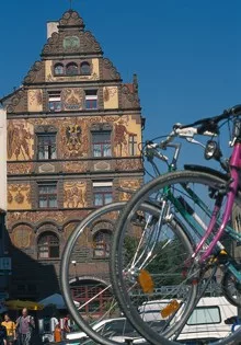 Sigo por la misma calle principal, o Calle del Mercado (Marktstrasse), y en la esquina me encuentro con la Fuente Imperial y el Edificio de El Lobo. La fuente es de 1897 y sus adornos y figuras son los originales, con numerosas alusiones al pasado de la ciudad. La que me llama la atención es la del pavo real de varias cabezas; leo que simboliza la iglesia regida por tres Papas a la vez. Esta situación dio lugar al Concilio de Constanza, entre 1414 y 1418. Junto a la fuente aparece el Edificio de El Lobo, de 1774, con su original fachada rococó, estilo que no se encuentra en otra construcción de la localidad.