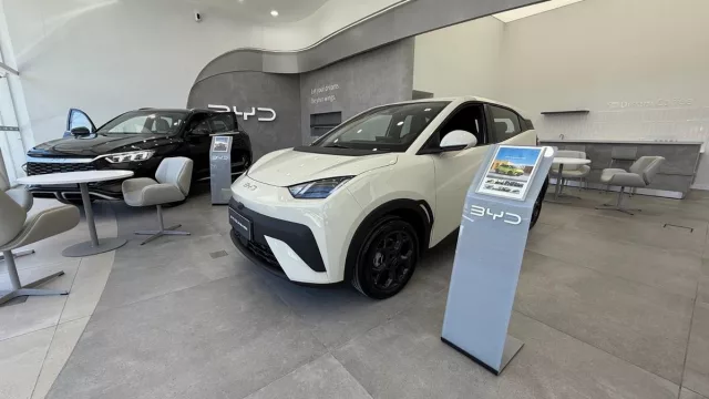 Fachada icónica: La intervención incluyó una remodelación total de la fachada, combinando materiales innovadores y las curvas icónicas que identifican globalmente a la marca BYD.