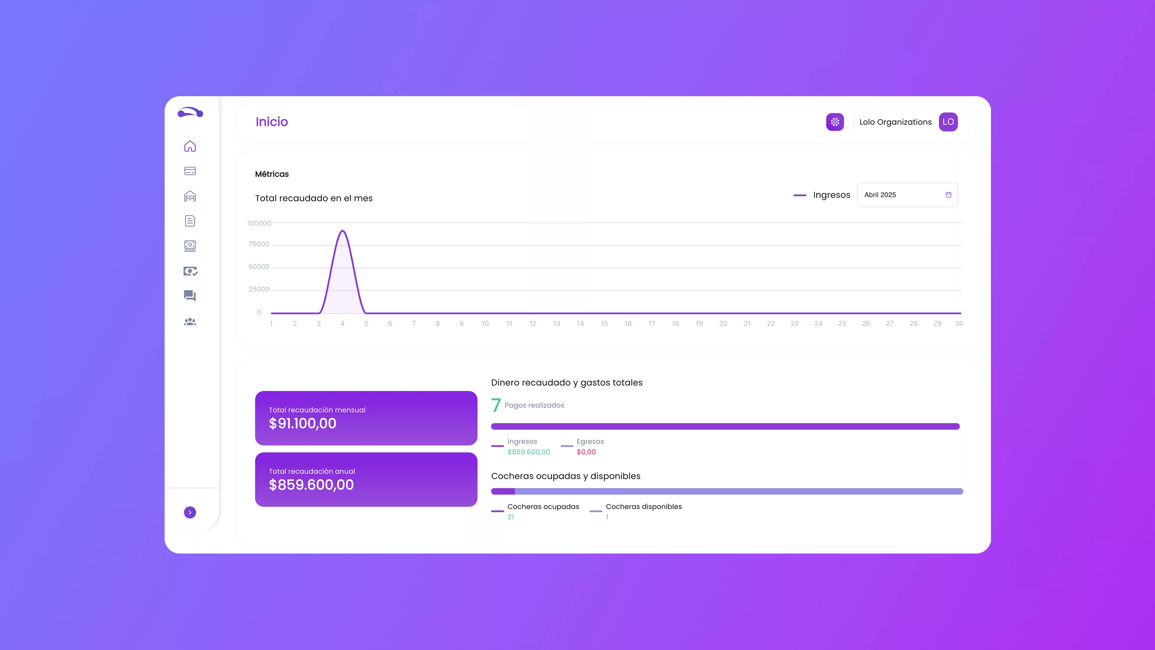 Dentro de la plataforma, se puede ver lo recaudado, el flujo de ingresos y gastos, espacios disponibles, tipos de alquiler, los pagos y moras y hasta la caja que cada empleado ha hecho desde que entra hasta que sale, sumado a un espacio de chat interno donde cada usuario puede avisar urgencias o información útil de cada cochera, todo en una interfaz dinámica y simple de entender y manejar.