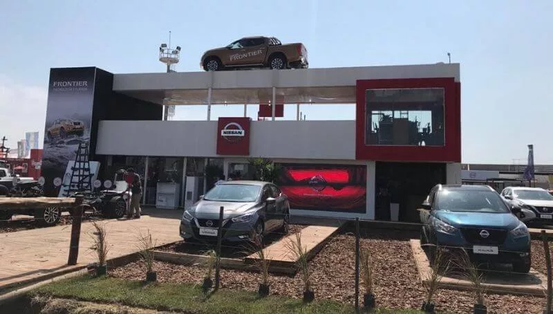 La marca desplegó un stand llamativo con fosas por debajo del mismo para la realización de test drive de la camioneta Frontier. También expuso otros modelos de autos.