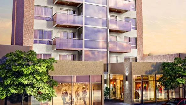Descripción: Una moderna edificación con piel de vidrio con unidades de 1 y 2 dormitorios, dúplex en pisos superiores, local comercial con entrepiso y dos subsuelos de cocheras.