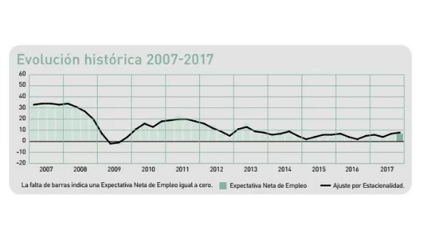 Así las cosas, de acuerdo con los 800 encuestados, las intenciones de contratación se mantienen estables respecto al trimestre pasado y crecen tres puntos porcentuales en comparación con el mismo período de 2016.