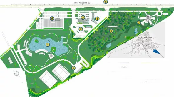 Asimismo, se aclara que en las 30 hectáreas que abarca el proyecto, se incluyen siete de bosque nativo, que se convertirán en un centro de interpretación para quienes quieran conocer la vida silvestre típica del norte provincial. Además, en las zonas de servicios se implantará una “cortina” de árboles con cuatro especies distintas, que evitará la erosión deteniendo los vientos.