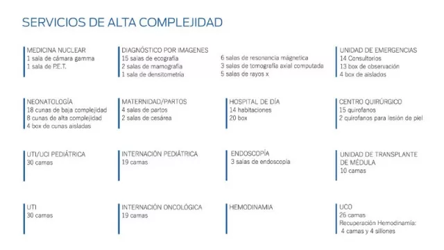 El edificio de Hospitalización será lo primero que se comenzará a edificar, y el mismo contará con 45.000 m2 cubiertos, 8 plantas, 400 camas, 17 quirófanos y estará focalizado en servicios y prácticas de alta complejidad: unidad coronaria; unidad de terapia intensiva; área de trasplante de médula e internación oncológica; un sector de aislados; un área destinada para la madre y el niño; quirófanos para cesáreas; servicio de neonatología; área de internación pediátrica; y unidad de terapia intensiva pediátrica. Además este edificio contará con un servicio de diagnóstico por imágenes con 6 resonadores, 3 tomógrafos, 15 salas de ecografía, 2 salas de mamografía, 5 salas de rayos x, entre otros. Y a esto se suman 2 salas de hemodinamia, 3 salas de endoscopía, servicio de medicina nuclear con PET y cámara gamma, entre otras prestaciones.