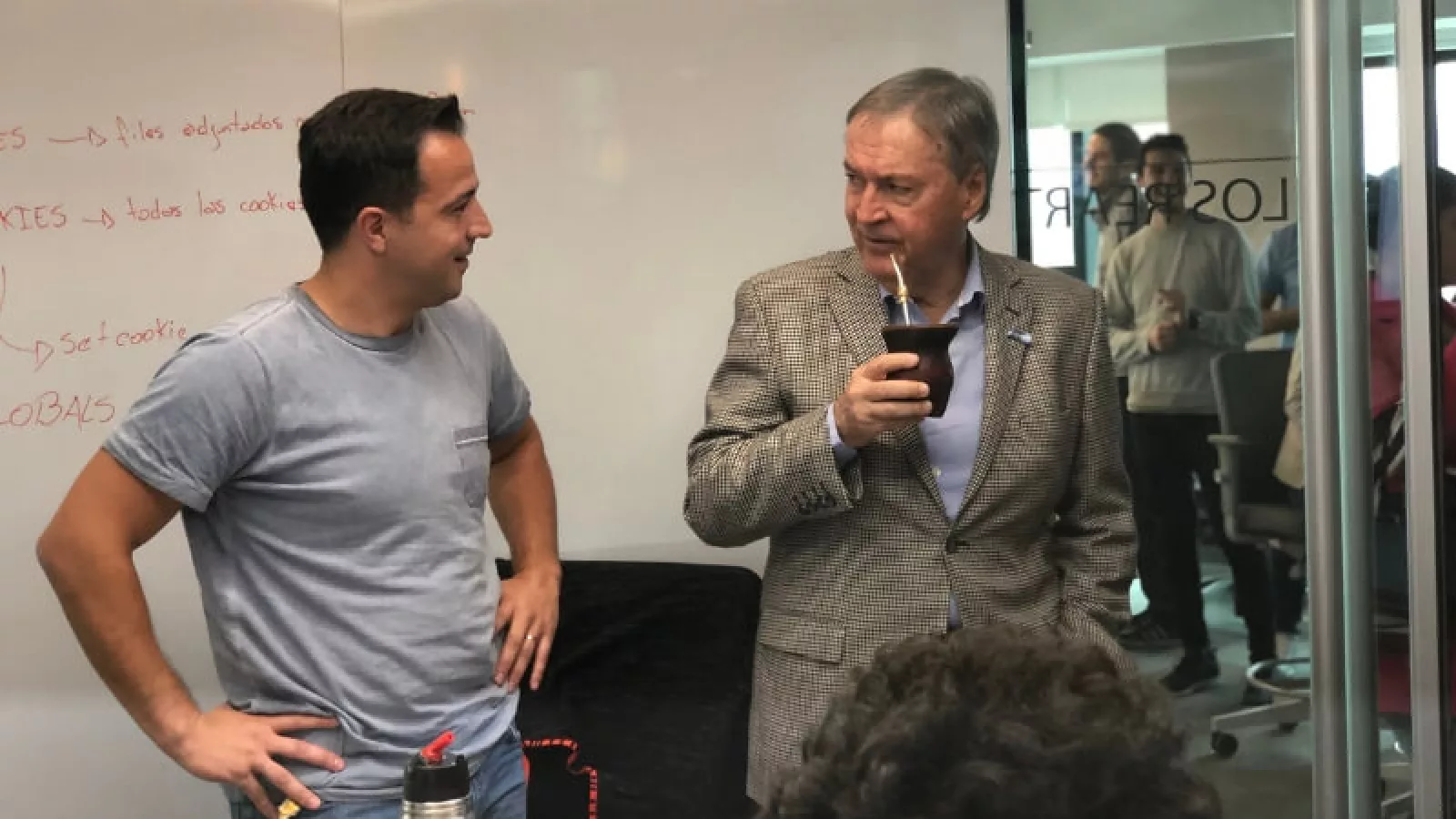 El gobernador Schiaretti toma mate con un ingeniero de Mercado Libre, ayer en la recorrida de las nuevas oficinas.