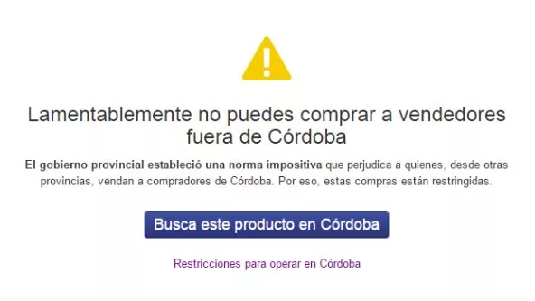 Lo concreto es que hoy ningún usuario registrado como perteneciente a esta provincia puede comprar a usuarios fuera de Córdoba en la plataforma MercadoLibre, con independencia del medio de pago que pensara usar.