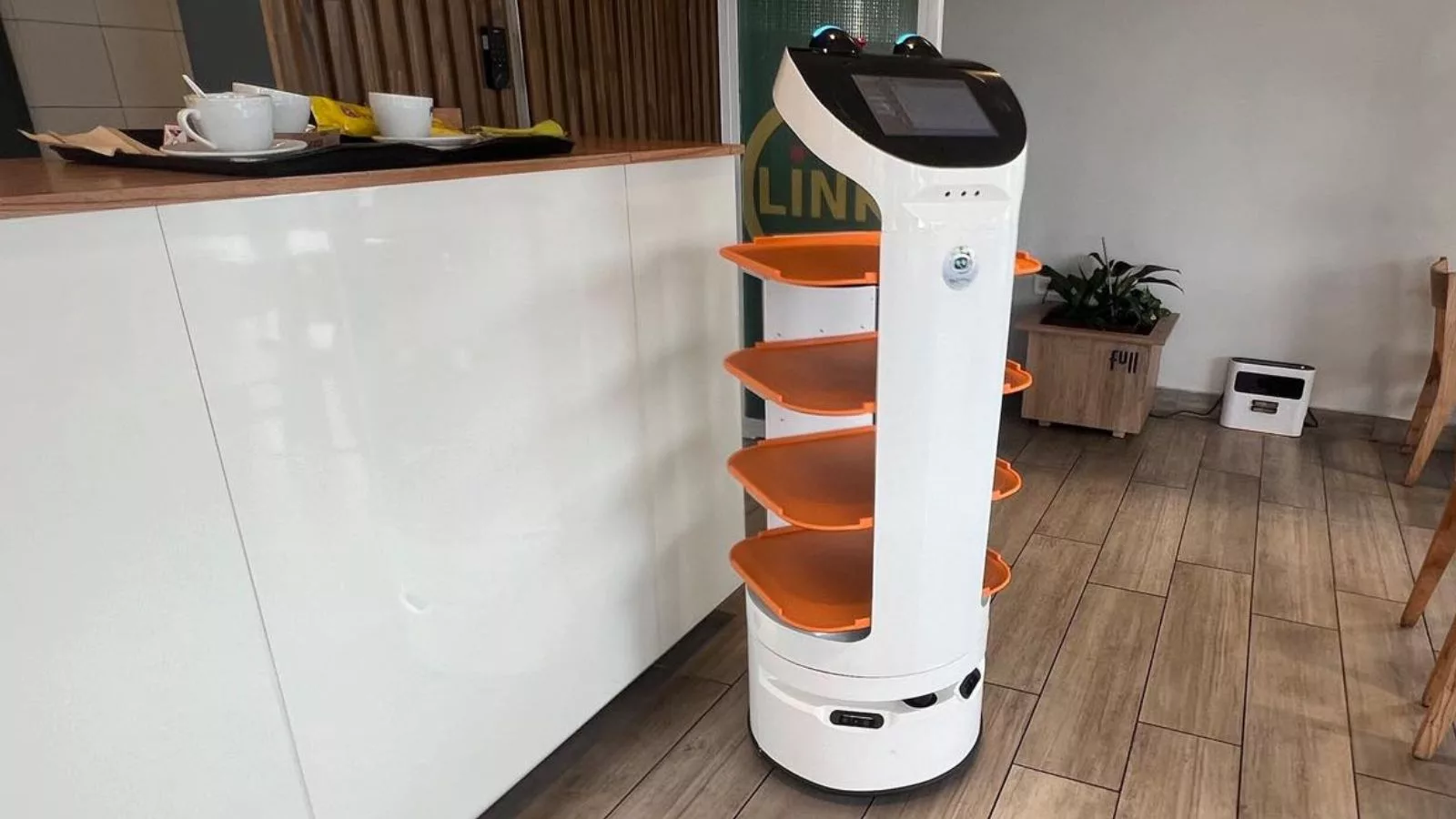 Dos robots colaboradores, diseñados para asistir en tareas de servicio en restaurantes, cafeterías, estaciones de servicio, patios de comida y shoppings.