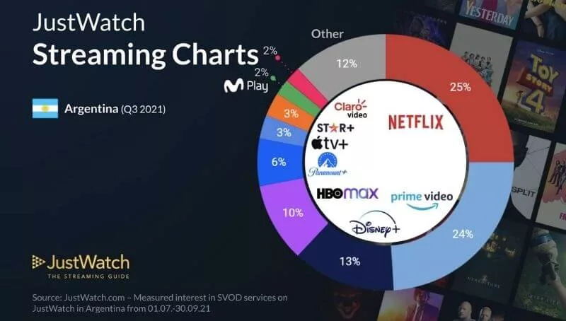 Según un relevamiento realizado por la plataforma JustWatch, Netflix sigue defendiendo su puesto como la plataforma de contenido de streaming on demand más usada, con un cuarto del total del mercado local. Le sigue, muy de cerca, Prime Video (la plataforma de Jeff Bezos), que queda apenas un punto porcentual por detrás, con el 24% de usuarios.