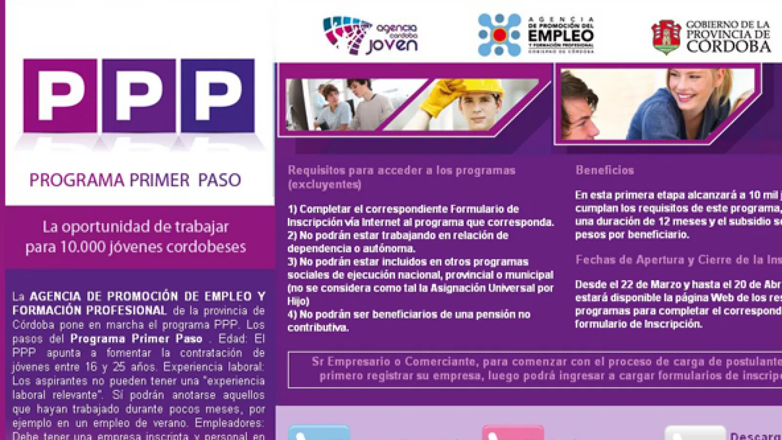 El PPP está destinado a jóvenes de 16 a 25 años. También contempla a discapacitados y transplantados de hasta 49 años, que se encuentren desocupados y registren domicilio en la provincia de Córdoba.