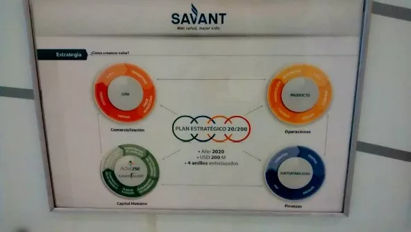 - "Estamos formando una compañía que esté orientada al mercado, formar una compañía muy fuerte, orientada al mercado. Nosotros tenemos el Plan Estratégico 20/200: para el año 2020 queremos facturar US$ 200 millones". Resume el dueño de Savant cuando se le pregunta por el mediano plazo. Este año la empresa facturará US$ 50 millones, con un 12% de crecimiento en unidades , (cuatro veces más que el promedio de la industria). El 10% de sus ventas proviene de la exportación.