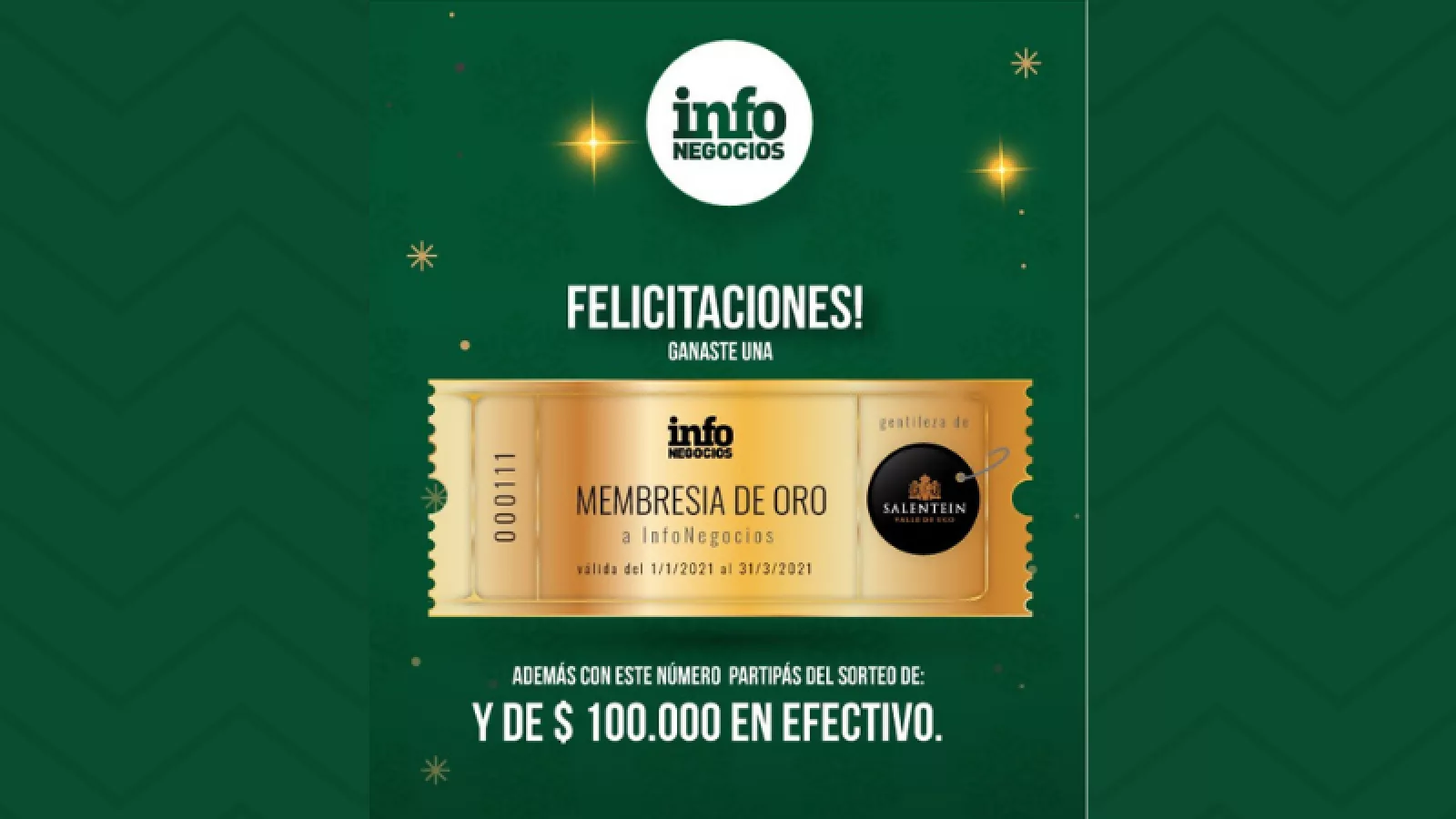 Cada lector que participe obtendrá un "ticket" que junto a su Membresía le asigna un número de 4 cifras: las primeras dos corresponden a cada una de las 100 marcas que participarán del Arbolito de InfoNegocios y las siguientes dos cifras son un número correlativo. Con los 2 últimos números participan (1 chance en 100) por el premio de la marca correspondiente y con los 4 números todos participan por el gran premio final de $ 100.000.