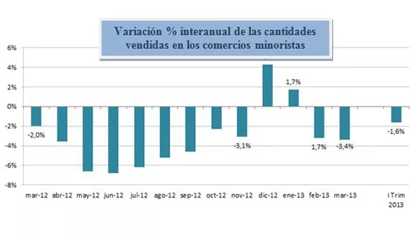 Con el resultado de marzo, las ventas minoristas medidas en cantidades finalizaron el primer trimestre del año con una caída de 1,6% frente al mismo periodo del año pasado.