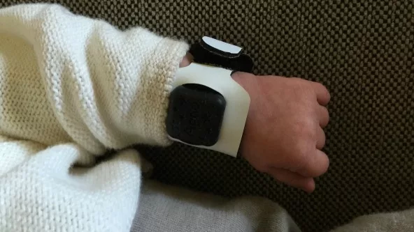 Las prendas -un guante o una muñequera y están trabajando en una botita- se comunica con enfermeros, paramédicos y también cuando el niño es dado de alta y cuando existe aún riesgo, vía bluetooth se comunica con los celulares del padre.