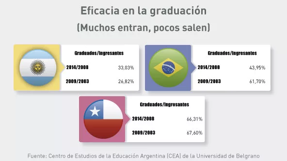 Hoy Argentina tiene sólo 28 graduados cada 10.000 habitantes, contra Chile que logra 48. Los dos países pasaron por sangrientas dictaduras hace 30 años pero resolvieron luego el tema universitario con políticas distintas.