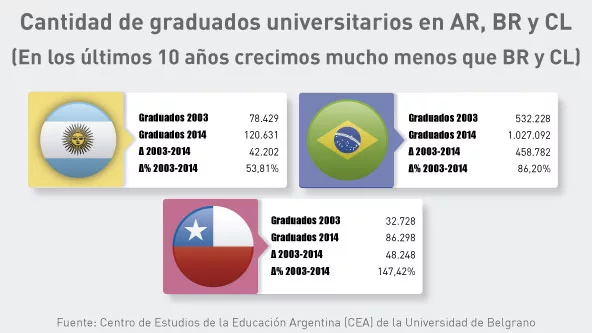 En los últimos 10 años, con los poderosos presupuestos que el kirchnerismo destinó a las universidades públicas (incluyendo la creación de muchas), Argentina logró un 53% de incremento de sus graduados. Brasil creció 86% y Chile 147%.