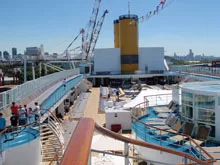 Embarcar los 2.250 huéspedes que puede alojar el Costa Victoria es una tarea que demora varias horas, aún con una tripulación de 800 personas y todo el apoyo en tierra de la compañía. A las 13 de ayer empezaron a subir los primeros pasajeros desde la terminal Quinquela Martín que todavía no está ni cerca de lo que se merece la segunda ciudad de Sudamérica; el operativo se extendió hasta las 17 para poder -finalmente- zarpar una hora más tarde rumbo a Angra dos Reis donde llegaremos el 25 a la mañana, tras dos días de navegación por el Atlántico. Construído en 1996, el Costa Victoria tiene 220 metros de largo (eslora) y 32 de ancho, 14 decks o cubiertas y 76.000 toneladas de peso. Mientras el aceitado sistema de embarque se encarga de traer las valijas hasta la puerta del camarote, los pasajeros aprovechamos la pileta (foto), los restaurantes y bares abiertos mientras le echábamos -de tanto en tanto- un vistazo a la tórrida Buenos Aires. Los apuros y los nervios iniciales van cediendo lugar a un andar más calmo como preámbulo de estos 7 días a bordo de este hotel flotante que nos permitirá -además- conocer (o repasar) tres destinos turísticos de Brasil (Angra, el glorioso Río e Ilhabela), para hacer un toque en la siempre amigable Punta del Este hasta de volver a nuestro destino inicial. Internet mediante, seguiremos en contacto aún desde alta mar, un lugar inquietante para este cordobés mediterráneo. (Más fotos del primer día de IB en el Costa Victoria en nota completa).