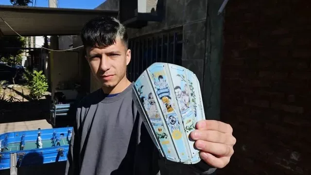Todo comenzó en 2019, cuando a Tomas Machuca jugaba al fútbol y se le rompieron las canilleras, no quiso pedirle a su familia que le compraran otras. Lo que hizo fue cortar un balde viejo con una sierra, le dió forma y diseñó con Paint una gráfica con fotos de su familia.