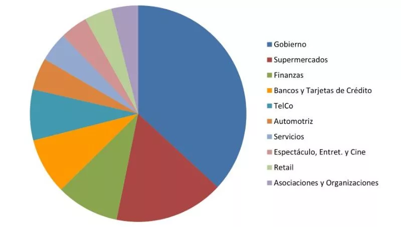Si hablamos de plata, el Gobierno invirtió en el primer semestre del 2023 la friolera de 1.094,9 millones de pesos, seguido por supermercados con $ 554,4 millones, bancos y tarjetas de crédito con $ 273 millones, finanzas con $ 227 millones y telecomunicaciones con $ 205,1 millones de pesos.