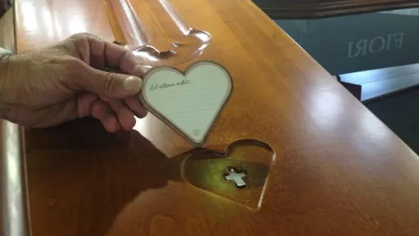 - Corazón con cruz: un cajón que cuenta con tres corazones desmontables y una cruz-dije escondida en su interior. El cliente puede llevarse el dije y escribir el “último adiós” en el corazón para que el ser querido sea enterrado con él.