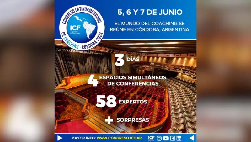 El 5, 6 y 7 de junio de 2024 se desarrollará en la ciudad de Córdoba el Congreso Latinomericano de Coaching, el evento presencial más importante de los últimos años, el cual reunirá durante tres días a destacados referentes de esta disciplina y del cual participarán cientos de coaches y estudiantes de coaching de los 15 países de Latinoamérica.