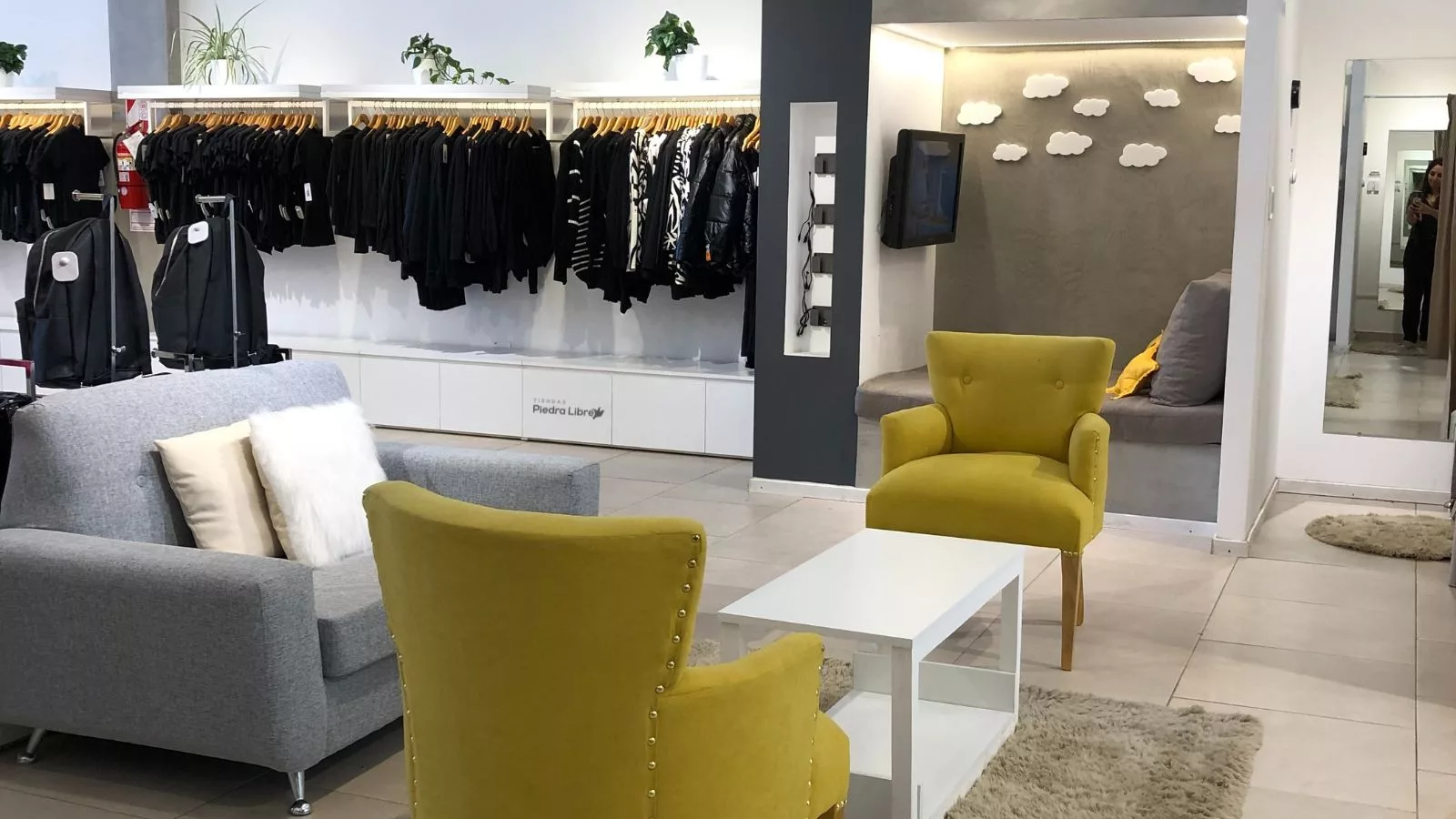El foco de Piedra Libre nunca estuvo solo en la ropa, sino en cómo se la vive. Sus probadores son amplios (de hasta 1,5 x 2 metros), algunos con sillones de dos cuerpos, espejos grandes, cortinas gruesas y hasta botones para llamar al vendedor sin tener que salir a buscar otro talle o color de indumentaria.