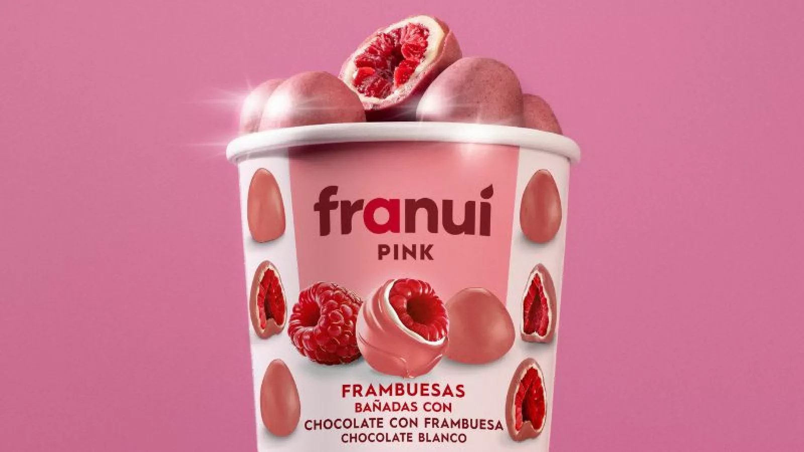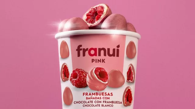 El distintivo tono rosa del Franuí Pink es resultado de un meticuloso y novedoso proceso de elaboración que combina frambuesas, chocolate blanco y polvo de frambuesas fusionado con manteca de cacao.