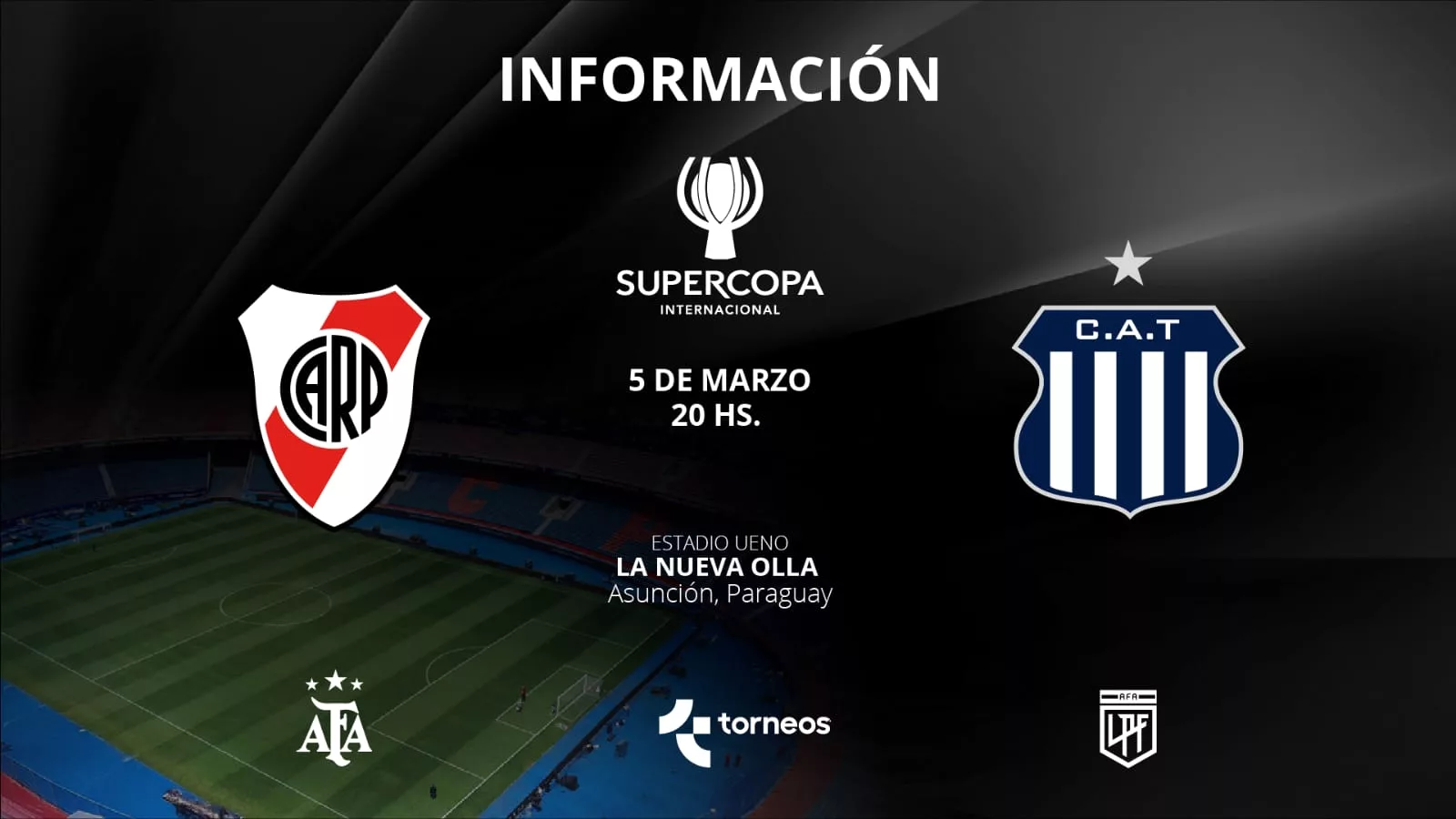La Supercopa Internacional celebrará su segunda edición con fecha, horario y sede ya confirmados. River Plate y Talleres de Córdoba se enfrentarán el miércoles 5 de marzo a las 20:00 en el estadio UENO La Nueva Olla de Asunción, Paraguay.