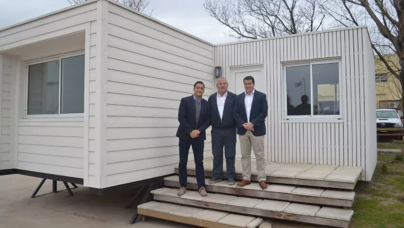 Están trabajando también con unidades modulares (estructuras de 3,40 por 3,40 metros). Combinan las estructuras y montan la vivienda completa en la planta y luego la trasladan y colocan lista en el terreno. En este momento tienen un proyecto de 3 casa de 2 dormitorios construidas con 12 módulos.