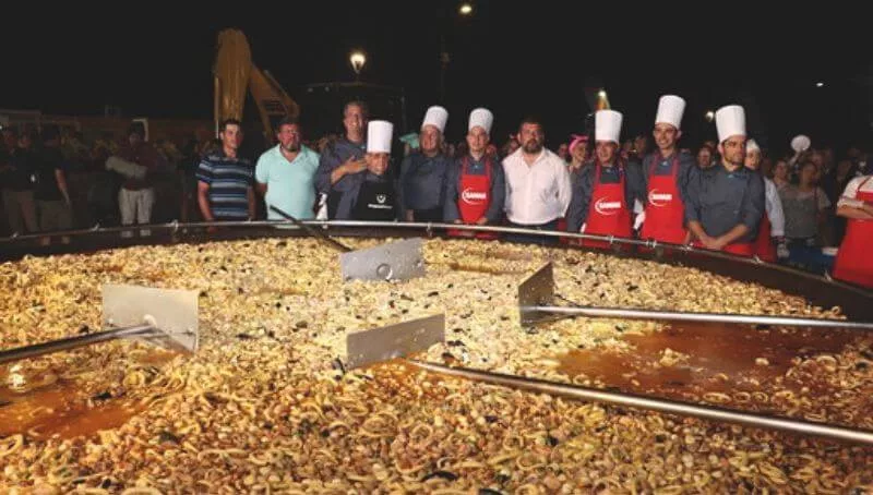 ¿La receta? 350 kg de arroz, 700 litros de caldo, 300 kg de pollo, 300 kg de cerdo, 600 kg de mariscos (mejillones, calamares, pulpa de mejillones, berberechos, calamares) y 200 kg de verduras.