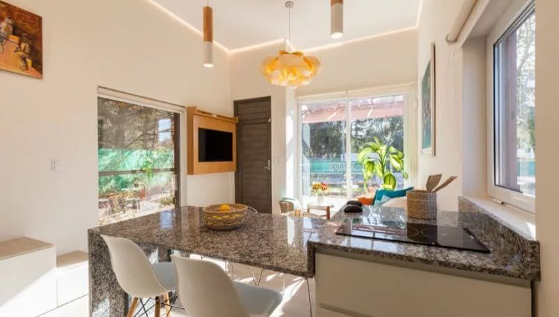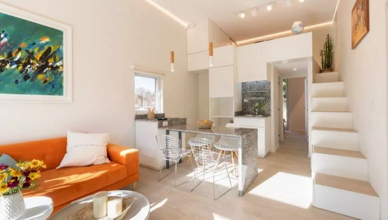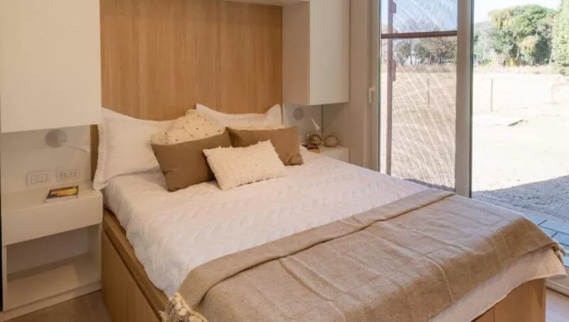 La casa modelo que puede visitarse en Villa Eucarística tiene 46 m2 y poco más de 13 m3 de guardado distribuidos en una sala de estar, cocina, baño zonificado, dormitorio principal y un entrepiso con un espacio para montar una habitación infantil o escritorio. Pesa 65 toneladas, viene completamente domotizada (hasta el aire acondicionado puede prenderse de manera remota) y puede adquirirse desde U$S 70.000. A eso hay que sumarle el traslado que dentro de la ciudad de Córdoba promedia los U$S 2.000.