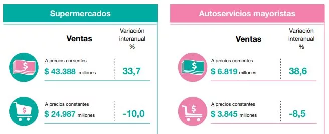En julio se empezó a sentir la retracción y desde ahí la variación porcentual interanual de las ventas totales de supemercados no deja de caer: