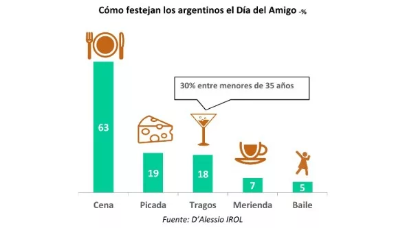 6 de cada 10 celebran la fecha comiendo. Comer y beber las excusas para encontrarse; le ganan a otros planes, como ir a bailar. A la tradicional cena se suman tragos y picadas. Para las mujeres, es tentadora la opción de la merienda con amigas.