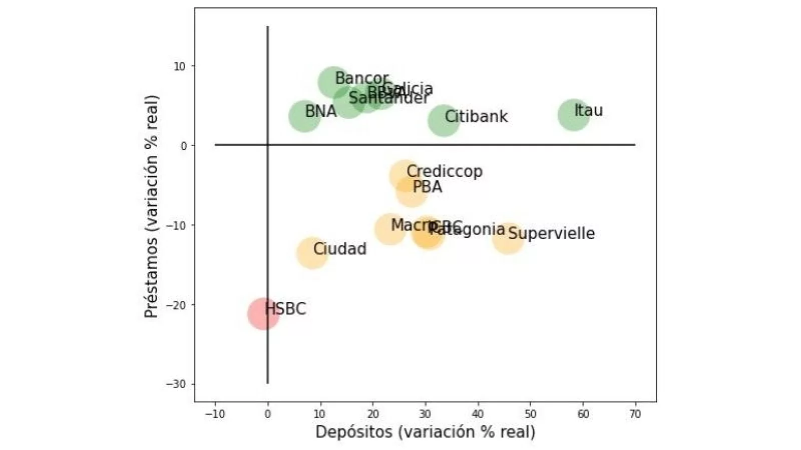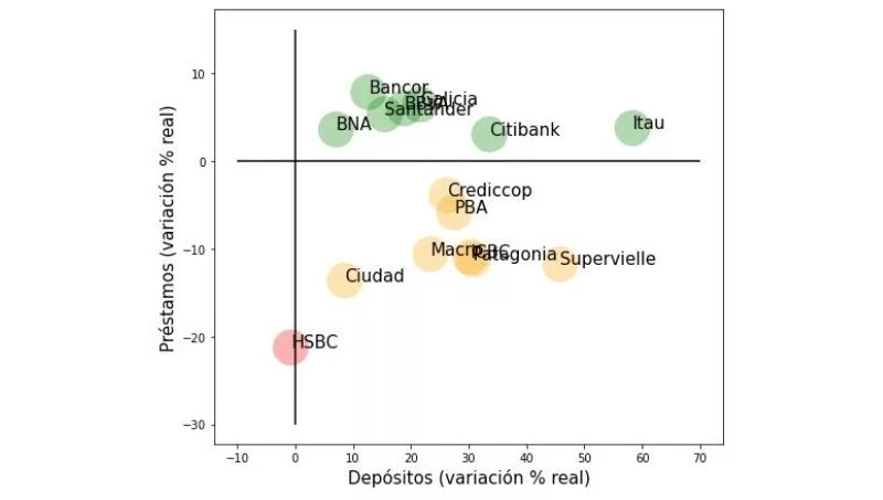 Pero eso son los promedios; cuando IARAF abre los cuadros, explica que: "Se aprecia que siete aumentaron tanto los depósitos como los préstamos: Banco de Córdoba, Banco de la Nación Argentina, Banco Santander, Banco Galicia, Citibank, Itaú y BBVA Argentina. Por otra parte, otros siete bancos subieron el nivel real de depósitos, pero bajaron el monto real de préstamos. Estos fueron Banco Macro, Banco Ciudad de Buenos Aires, Banco Credicoop, Banco Patagonia, Banco Provincia de Buenos Aires, Banco Supervielle e Industrial and Commercial Bank of China. En el cuadrante que aloja a los bancos que bajaron tanto el nivel de depósitos como de préstamos a privados, se ubica solamente el HSBC Bank Argentina.".