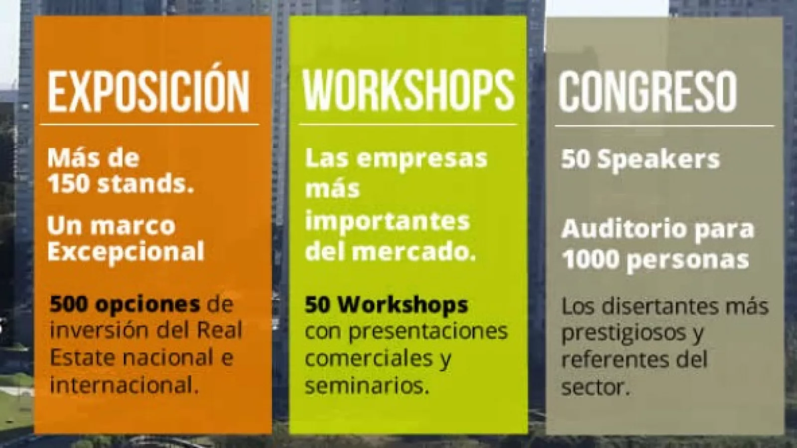 Las principales empresas del mercado tendrán la oportunidad única de exponer todos sus productos para un público exclusivo y calificado contando con un salón de exposición con más de 150 stands diseñados para la promoción de desarrollos/proyectos inmobiliarios nacionales e internacionales y un sector de workshops comerciales, rondas de negocios y seminarios que brindan capacitación del más alto nivel con temáticas relevantes para todo el sector.