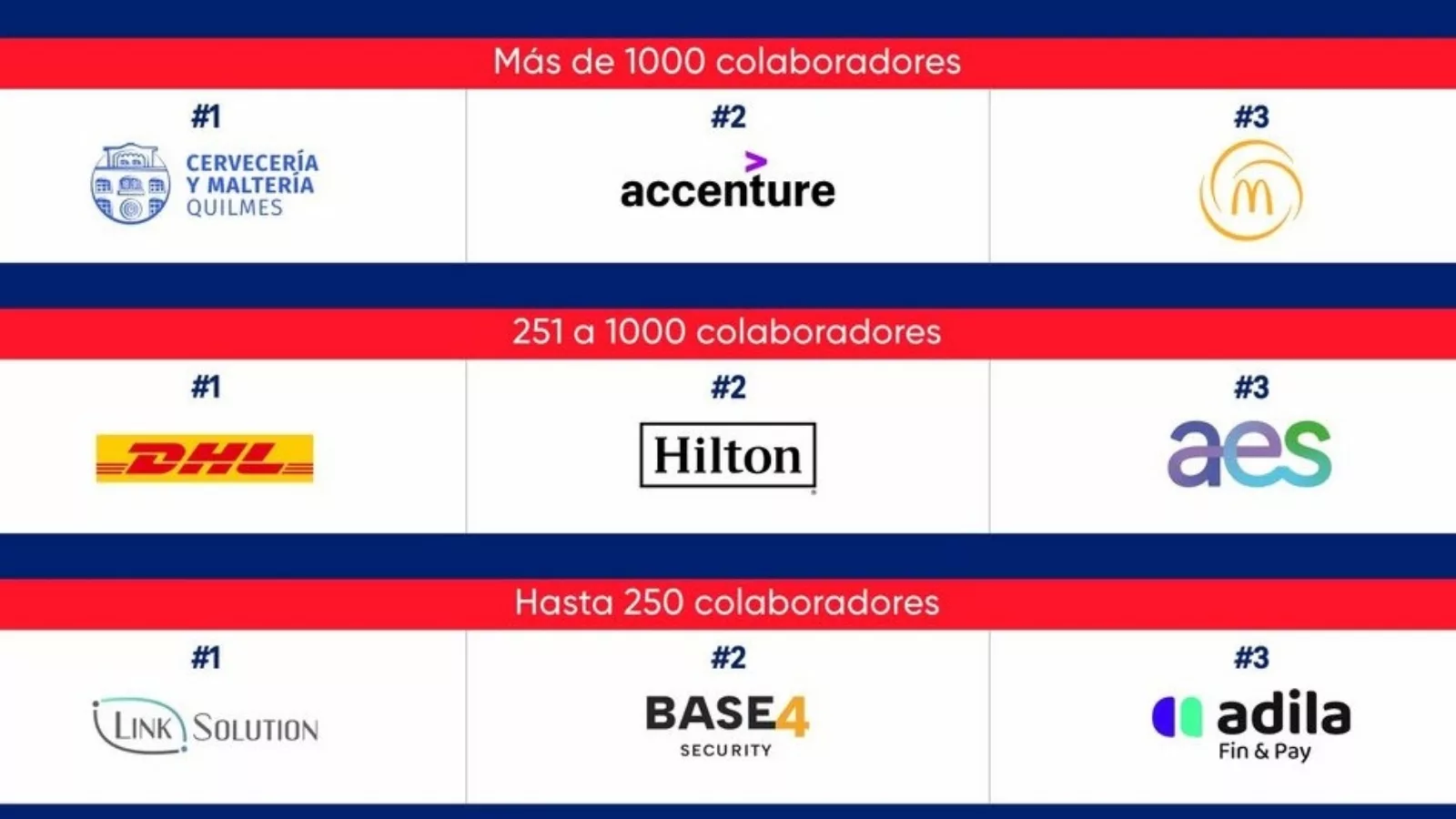 Cervecería Quilmes, Accenture y Mc Donalds se situaron en lo más alto del podio, entre las compañías de más de 1000 empleados, mientras que DHL, Hilton y AES ocuparon los primeros puestos en la categoría de 251 a 1000 colaboradores.