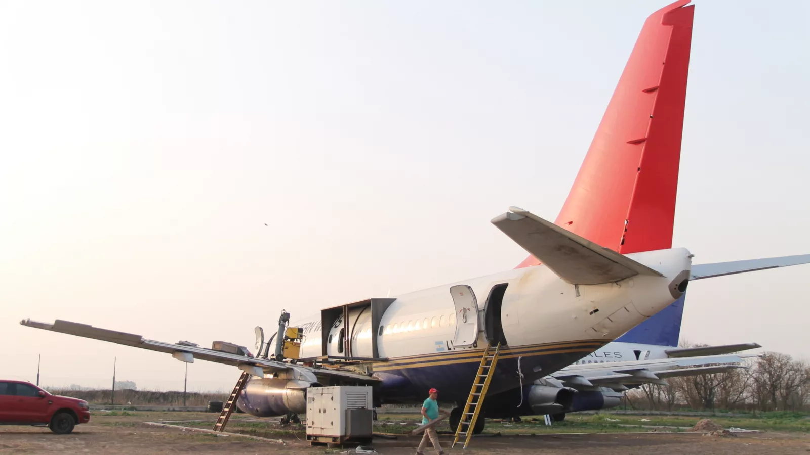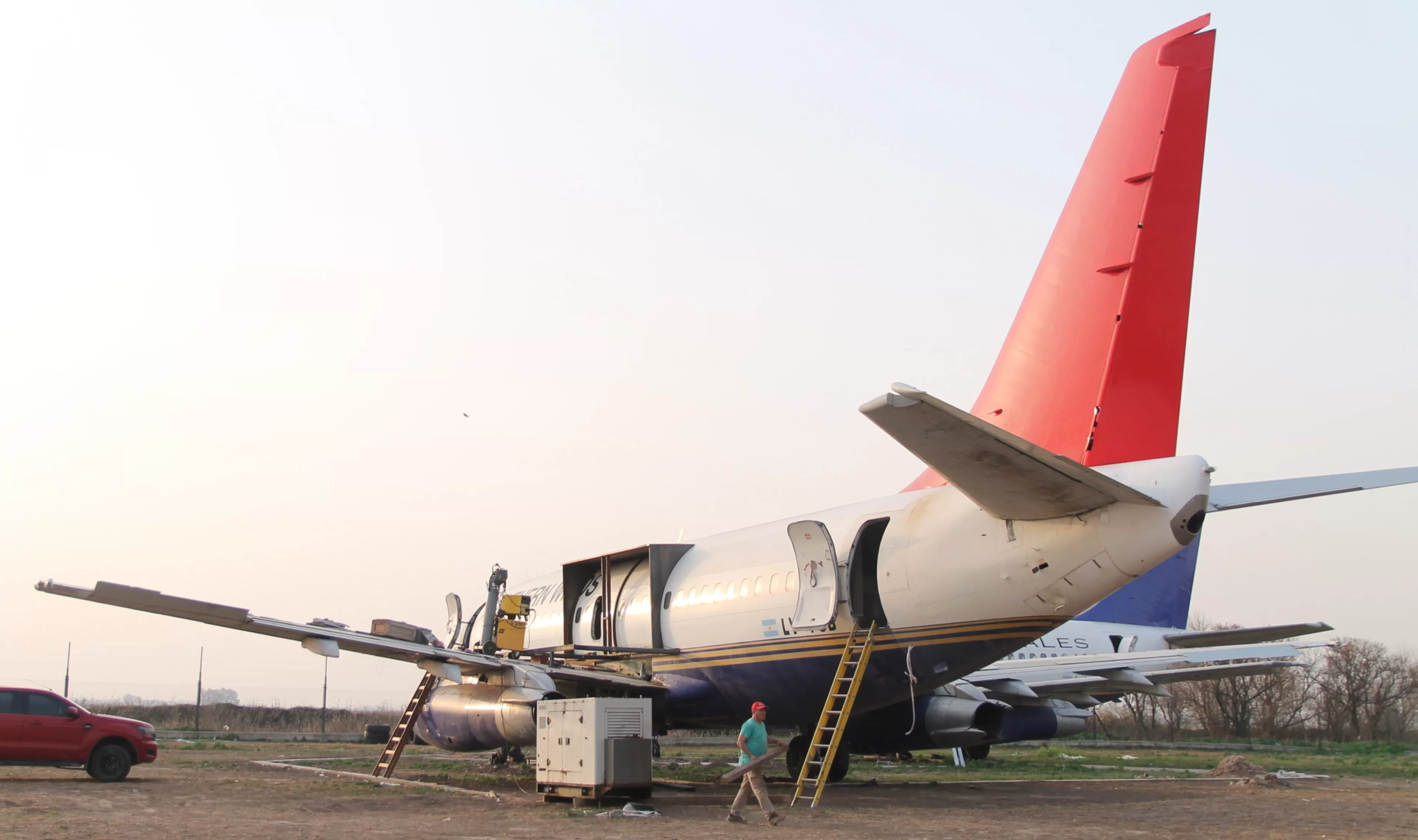“Trae la mulita, así subimos al avión”, le dice Scorza a uno de los trabajadores. Nos elevan en la tarima hasta el ala del avión. El viento embiste con fuerza. Entramos en una de las habitaciones, donde los técnicos aún trabajan en la instalación eléctrica. La sensación es única. Las ventanillas, que antes ofrecían el cielo como horizonte, ahora enmarcan un campo fijo, esperando que comience el viaje.