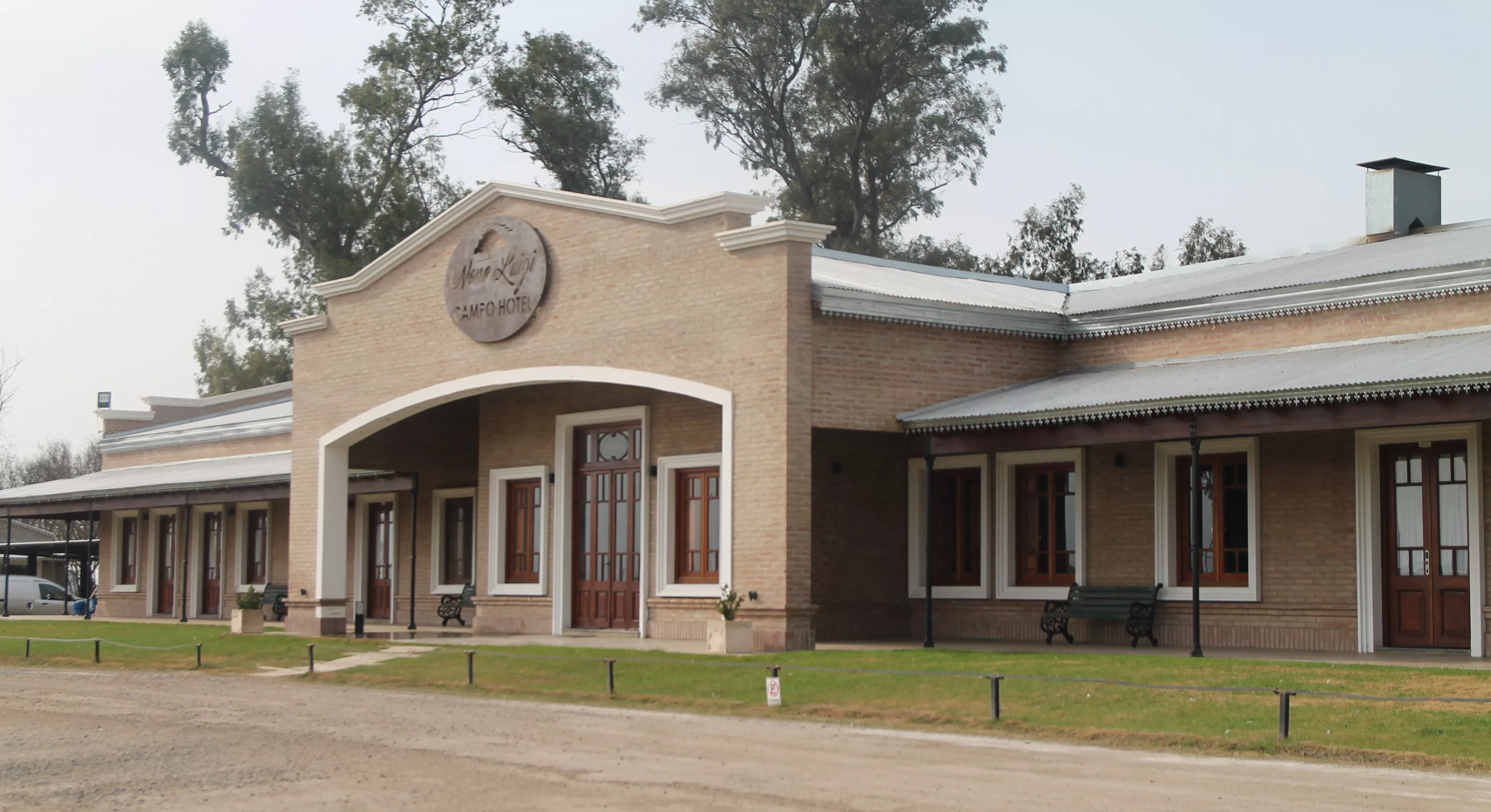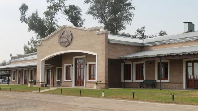 La fachada del hotel, inspirada en una antigua casona del ferrocarril, se impone con su galería en medio del campo. La puerta principal da acceso al restaurante, donde comienza el viaje. ¡Bienvenidos a Nono Luigi Campo Hotel, un rincón insólito en Córdoba, el único con habitaciones VIP en un avión!