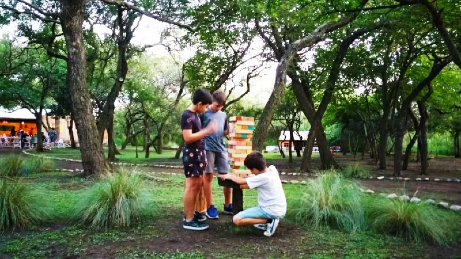 ¿Qué tipos de juegos hay? Todos son muy sencillos. Una casita de madera, hamacas, tela, subibaja invertido, un arenero lleno de herramientas, juegos de mesa, zancos, juegos de puntería con pelotas de trapo lanzadas desde una gran gomera, un circuito de cubiertas sujetados a una soga y hasta un pesca magic, un monkey loco y un jenga gigantes. También tiene cancha de fútbol.
