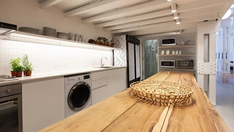 El living es un espacio luminoso con un gran ventanal que da a Av. de Mayo. En la mitad del mismo se encuentra una barra móvil para que cada viajero se sirva a sí mismo de la chopera y viva la experiencia de tirar cerveza. Por su parte, la cocina compartida tiene un diseño minimalista y está totalmente equipada.