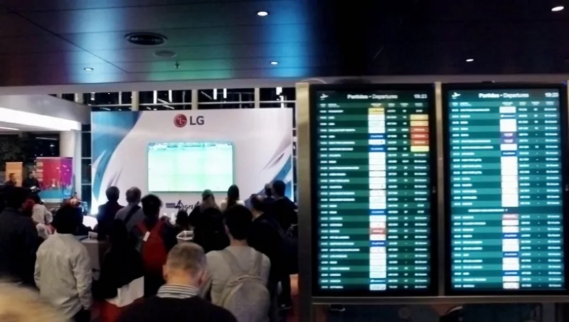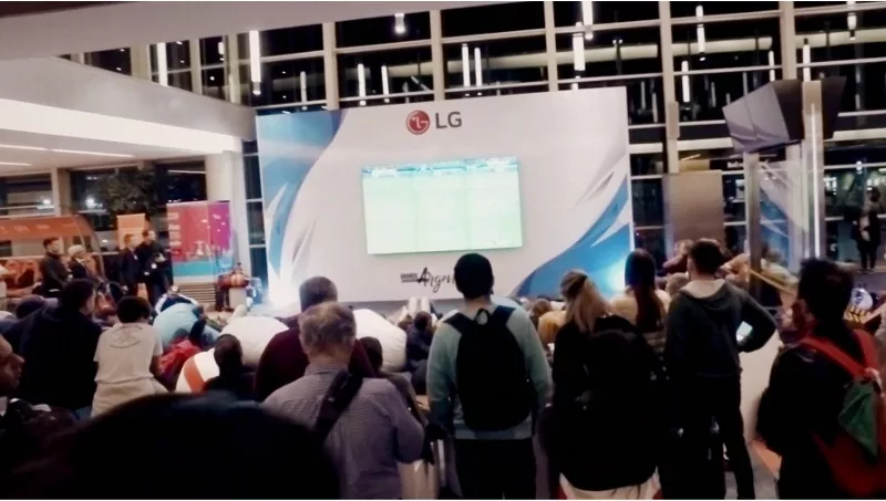 A partir de un acuerdo con Aeropuertos Argentina 2000, LG Electronics acompañará la pasión de todos argentinos transmitiendo los partidos en vivo en este mini estadio montado en Ezeiza, que cuenta con una pantalla gigante compuesta a su vez por 9 pantallas de alta resolución de 47" con bordes ultra delgados. Esta propuesta se puede encontrar en la zona de preembarque internacional, para que los usuarios que estén de paso puedan alentar a la selección.