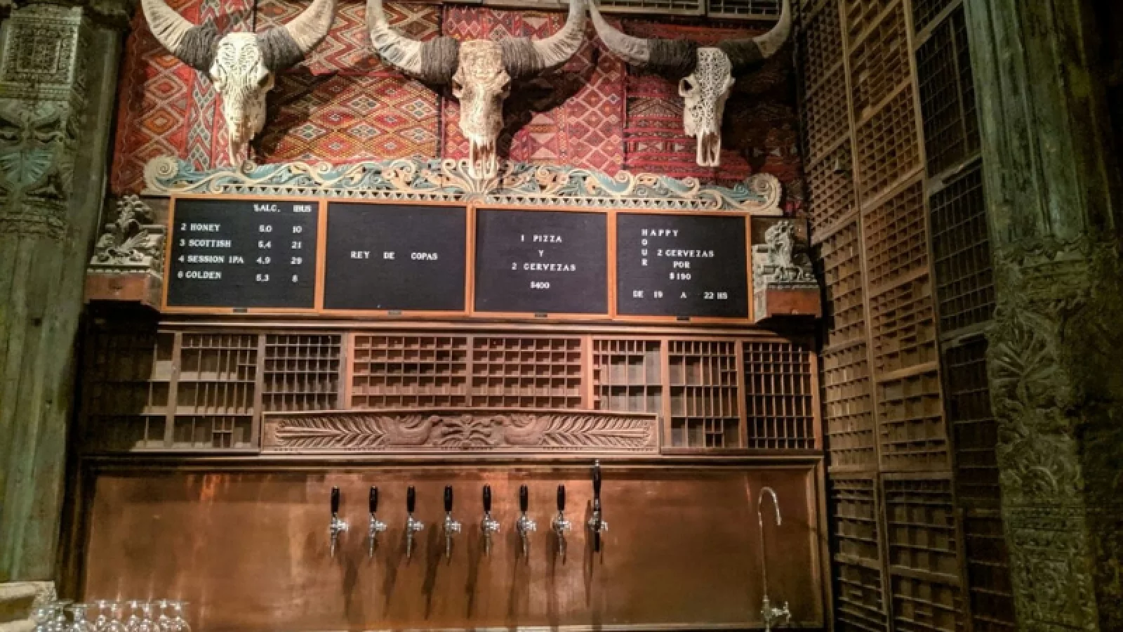 Los tablones tallados de Carlos Páez Vilaró, ubicados en el fondo de barra de la terraza, son reliquias que se mantienen para contar escenas de la vida cotidiana de los pueblos africanos.
