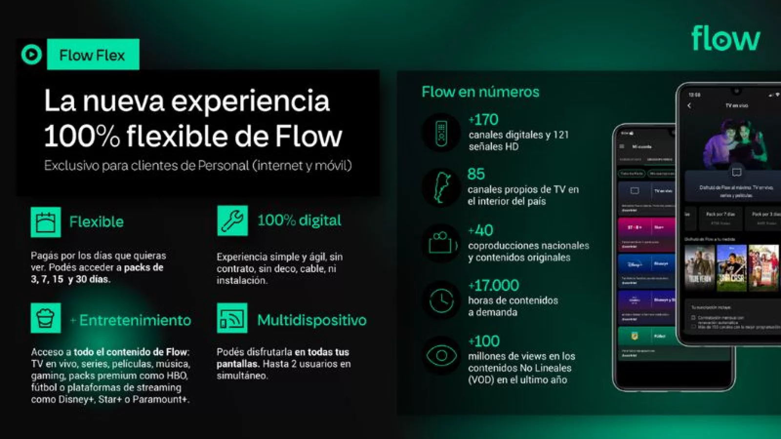 Los clientes de Personal (de internet móvil o fijo) van a poder contratar packs de 3 ($ 400), 7 ($ 750), 15 ($ 1300) y hasta 30 días con acceso a TV en vivo, series y películas on demand, o paquetes mensuales de Flow Flex integrado a servicios adicionales que requieran (OTTs o pack Fútbol y otros) todo desde la propia aplicación digital de Flow.