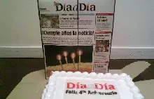 Los cólegas de Día a Día festejaron ayer su 4º Aniversario y nos hicieron llegar una torta exquisita (de la que ya no queda nada) y dos botellas de vino en un packaging de madera muy bien presentado (by Dvino). Tras haber agregado las ediciones de sábado y domingo, Día a Día es ya el 2º diario en venta de ejemplares en Córdoba y alcanza una tirada de 14.525 ejemplares promedio de lunes a domingos, lo que con un readship de 4 personas por ejemplar redondea los 58.100 lectores.